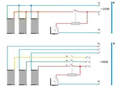 При монтаже мощных систем для больших помещений (домов, гостиниц, школ, детских садов, магазинов, супермаркетов, офисных центров и т.д.), где рабочие токи превышают номинальный ток терморегулятора, необходимо использовать магнитные пускатели, реле, модульные контакторы. В этом случае термодатчик управляет только катушкой.