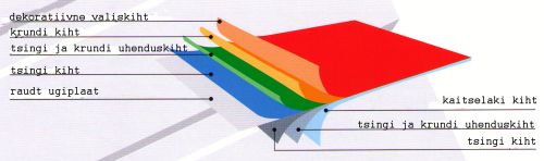 Teie hoone eluiga sõltub tugiplaadi kaitsest väliskeskkonna eest. Meie poolt pakutavates sandwich-paneelides kasutatakse rauast tugiplaati paksusega 0,5-0,65 mm firmalt RUUKKI. Raud on kaitstud 4 kaitsekihiga, alustades tsinkimisest, ning edasi, pärast krunti kaetakse tsingi kiht Plastizol-iga, PVDF-ga või Pural-iga.