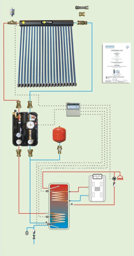 12. Накопительный резервуар с двумя медными теплообменниками 13. Основная система отопления на основе газового, электрического или другого котла.